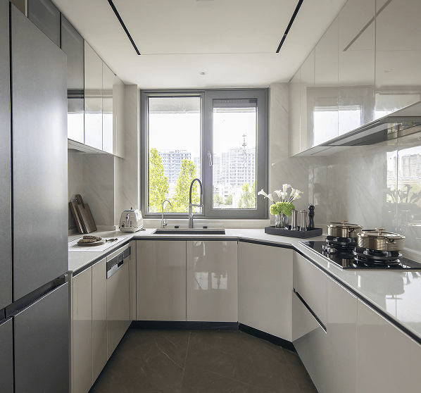 厨房设计同样实现创新升级,采用升降拉篮、转角钻石柜等设计,提升厨房空间利用率,防潮防尘还便于取物。燃气灶增加防干烧功能,无锅燃烧2分钟内自动熄火,为家庭提供安全保障。