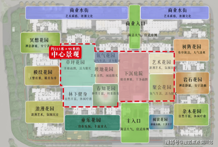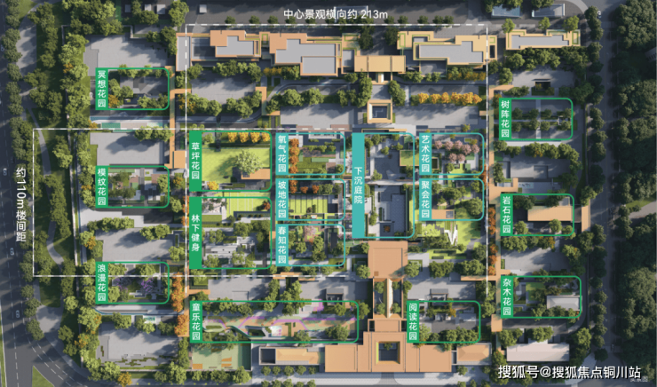 项目特邀GTS蓝颂宋淑华亲自操刀,于东西轴约213米、南北轴约95米的空间留白上,围合出约2万㎡的中央花园,包含一个立体核心(下沉庭院)、5大主题花园(艺术花园、聚会花园、洋气花园、坡地花园、春知花园)、2大拓展空间(草坪花园、林下健身)。
