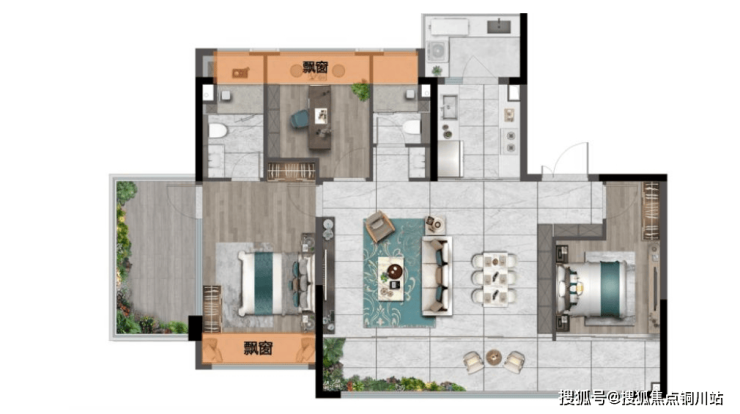 比如,全屋赠送四个飘窗,合计约7-8㎡,全部不计入产权面积,飘窗较常规进深提升约33%达到了80cm,室内空间进一步扩大,主卧的全景飘窗更是拓宽了采光面和观景视野;开间约9.6米南向阳台,除了满足日常独立晾晒、休闲需求,可整合儿童成长、家庭储物和社交娱乐三大功能;厨房北侧创新推出约4.5㎡设备平台,联通厨房设计,可灵活改造为家政间,为整体空间拓展使用面积。