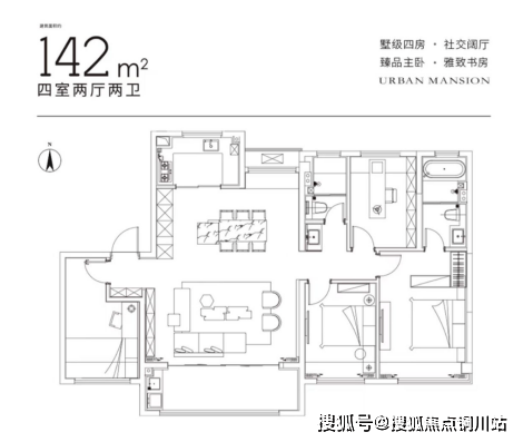 建面约142㎡户型,四室两厅两卫设计,一梯一户,独立玄关,四开间朝南,定位终改人群,可容纳三代至四代同堂。
