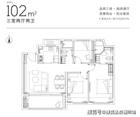 建面约102㎡户型,三室两厅两卫设计,南向三开间朝南,客餐厅一体化;厨房U型设计,极大程度保证操作面;主卧套房设计。