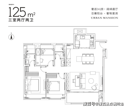 建面约125㎡户型,三室两厅两卫设计,户型方正,南北通透,比起102来说视野更加开阔;客餐厅一体化设计,大片落地窗,阳台阔朗程度甚至可以作为多功能空间。