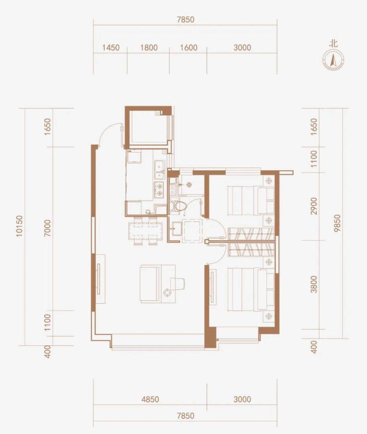 约85㎡两居,相比之下尺度更加阔绰,舒适度更高。客厅开间约4.85米,尽可能保证室内采光效果。