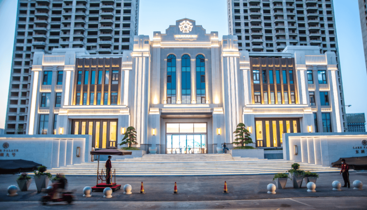 沙湖九号采用 Art Deco 装饰主义融合新古典主义风格,将现代建筑的简洁流畅与古典建筑的典雅庄重完美结合。建筑外立面采用全石材干挂,选用高品质的花岗岩石材,经过精心雕琢和打磨,呈现出细腻的质感和独特的光泽。这种建筑材质不仅具有良好的耐久性和稳定性,能够经受住时间的考验,而且在外观上彰显出高贵、大气的气质。建筑的线条简洁明快,通过几何形状的巧妙组合,营造出强烈的视觉冲击力。顶部的装饰造型犹如皇冠一般,彰显着建筑的尊贵身份,为整个小区增添了一份独特的魅力。