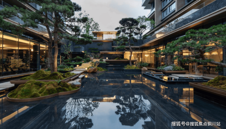 下沉式庭院,融入立体景观理念打造,园中的双杆黑松、赤松、油松都是总经理亲自挑选而来