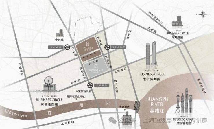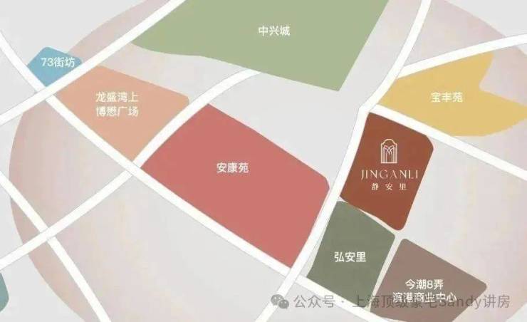 东邻今潮8弄(巴金图书馆、滨港商业中心已绽放)、西接安康苑&龙盛湾上(规划超甲办公/星级酒店/石库门商业),南望弘安里传世石库门大宅。