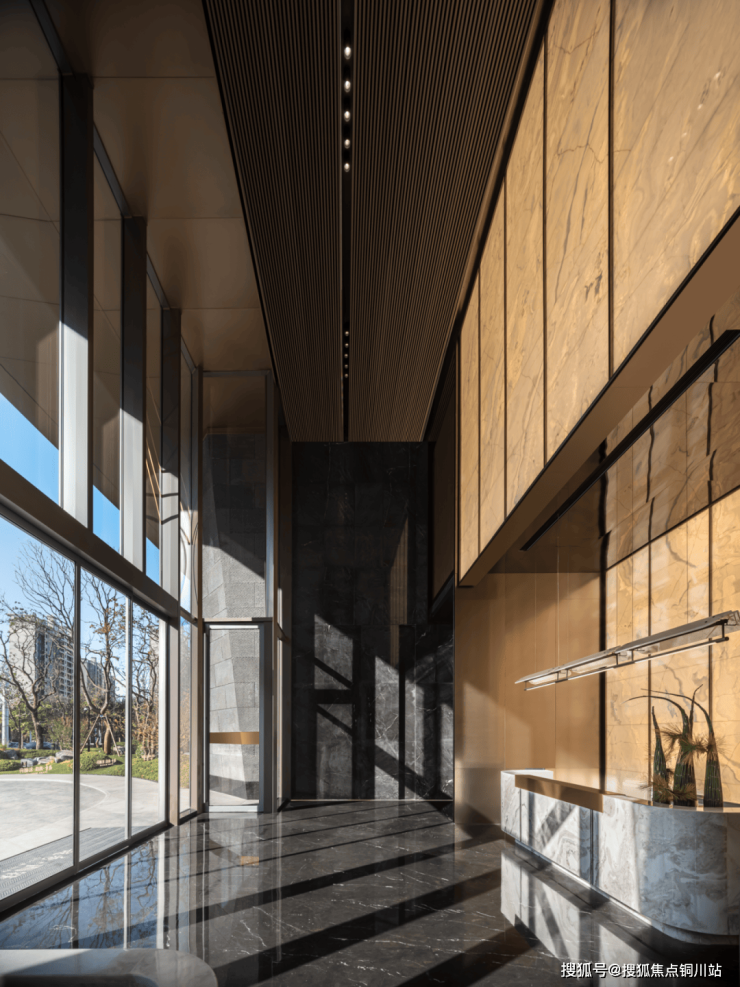 步入前厅,巨大的落地玻璃窗让洒落的光线变得柔和而自然,精致的石材在光线下呈现出独特的光泽。