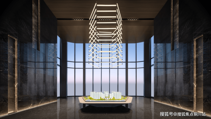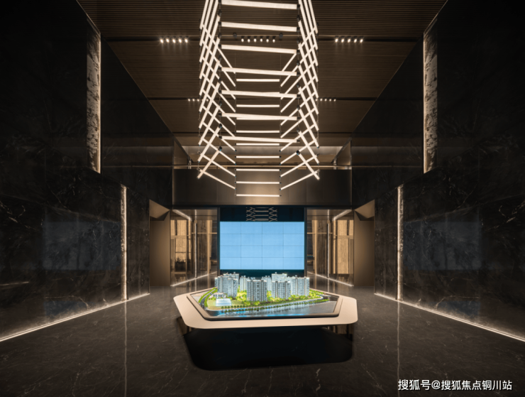 沙盘展示区的设计独具匠心。中空悬吊的大型艺术装置吊灯,灵感源于鸟巢,以几何抽象的当代艺术手法重新演绎,寓意白鹭归巢,心之归所。