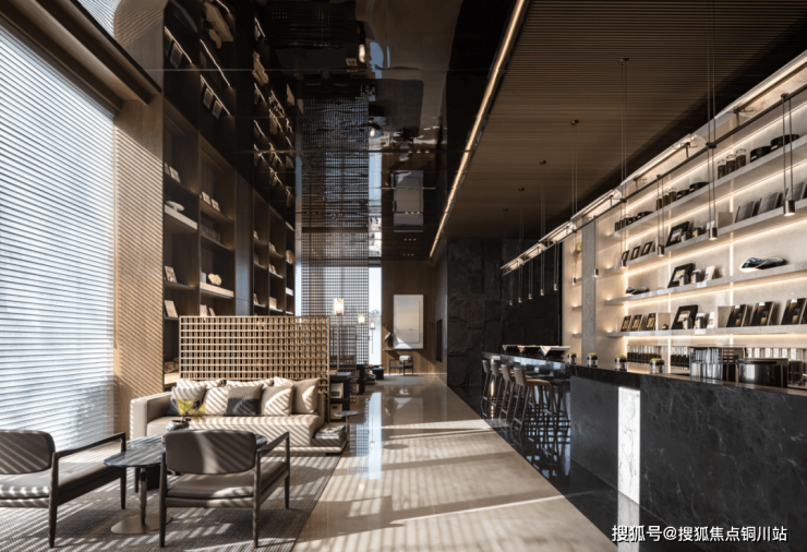 水吧区艺术廊道聚焦的空间纵深,抬眼望去,远处的艺术品端景于中心处显现。两侧来自户外的自然光线透过格栅散入其中,吧台柜体巧妙的灯光布置,于天花地面渲染出独特的光影,一步一景,引人探寻。