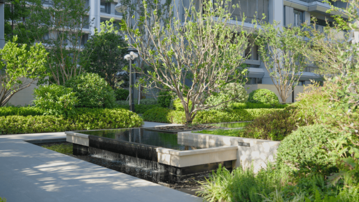 玖著叠墅区新增中央雕塑和水景区,流水的摇曳变化与植物的光影融为一体。