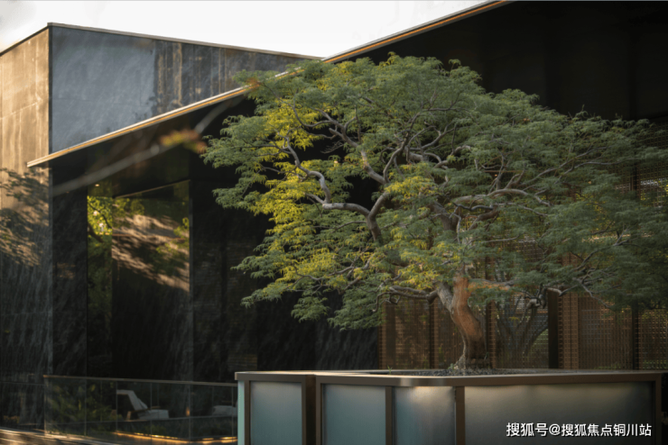两侧则是罗汉松和景墙,采用漏景的处理手法,拉出中轴对称的仪式感。