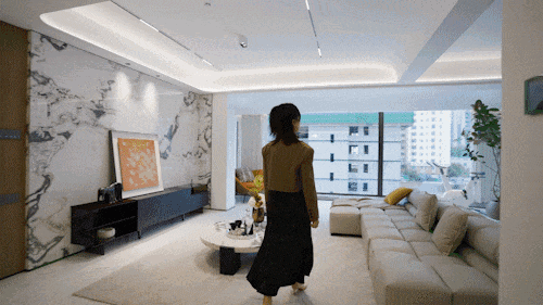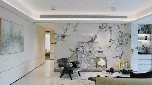 高定奢石芬迪白背景墙,一直延续至阳台,使整个空间完美衔接,加上开放的中西厨设计,生活游刃有余。