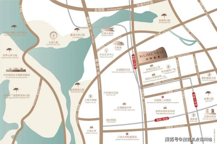 ●双轨交汇:临近地铁4号线五湖⼤道站(直线距离约800m)及规划中的地铁6号线⾦⽯路站(直线距离约200m),未来可通过4号线和6号线换乘站点超过20个,便捷通达无锡市区全域。