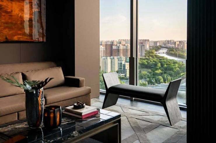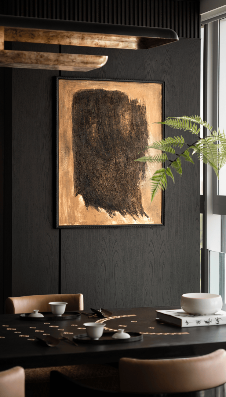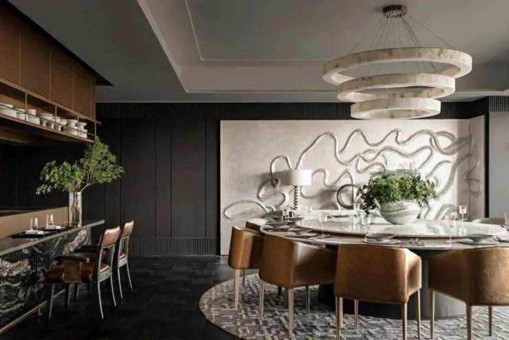 从空间到文化的升维表达:无界复合场景,两套户型打通后,围绕核心筒展开茶室、私宴区、影音室与270°观景廊,通过“洄游动线”串联功能,实现商务宴请、艺术沙龙、家族聚会的自由切换。
