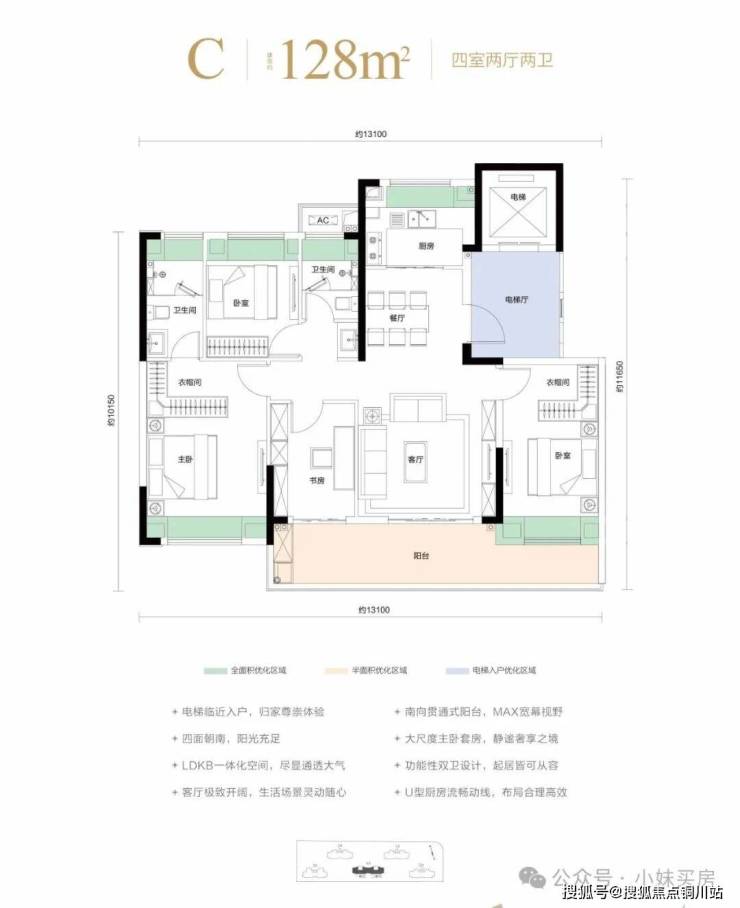 建面约128㎡,2T2户设计,拥有约7㎡电梯前室,有约47㎡LDKB一体化空间、近29㎡大尺度主卧套房,空间感完全不输传统145㎡……