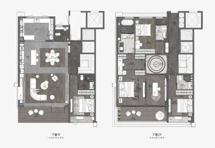 整体基底抬高后,下叠户型拥有了182㎡的一线湖景庭院,该户由沿湖景观驳岸入户,体验感拉满;上叠户型则设置了四层及五层近百平米的全景露台空间。沿湖布置的“观湖墅”建筑高度低于内部庭院叠墅产品,使得住区内部的顶层露台均获得了观湖视野,实现了景观资源利用的最大化。