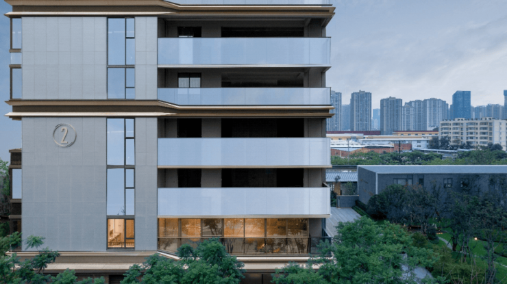 由gad设计的杭州融创·天阅云合源,立面上类似“古韵新作“以冷灰色石材干挂传达传统白墙、灰砖的审美情趣,辅以暖金色铝合金线条体现传统木作的温暖感,再以香槟金色铝板勾勒出一个个形自传统漏窗的大幅面玻璃,错落有致,活泼又格调斐然。