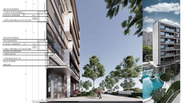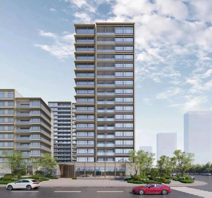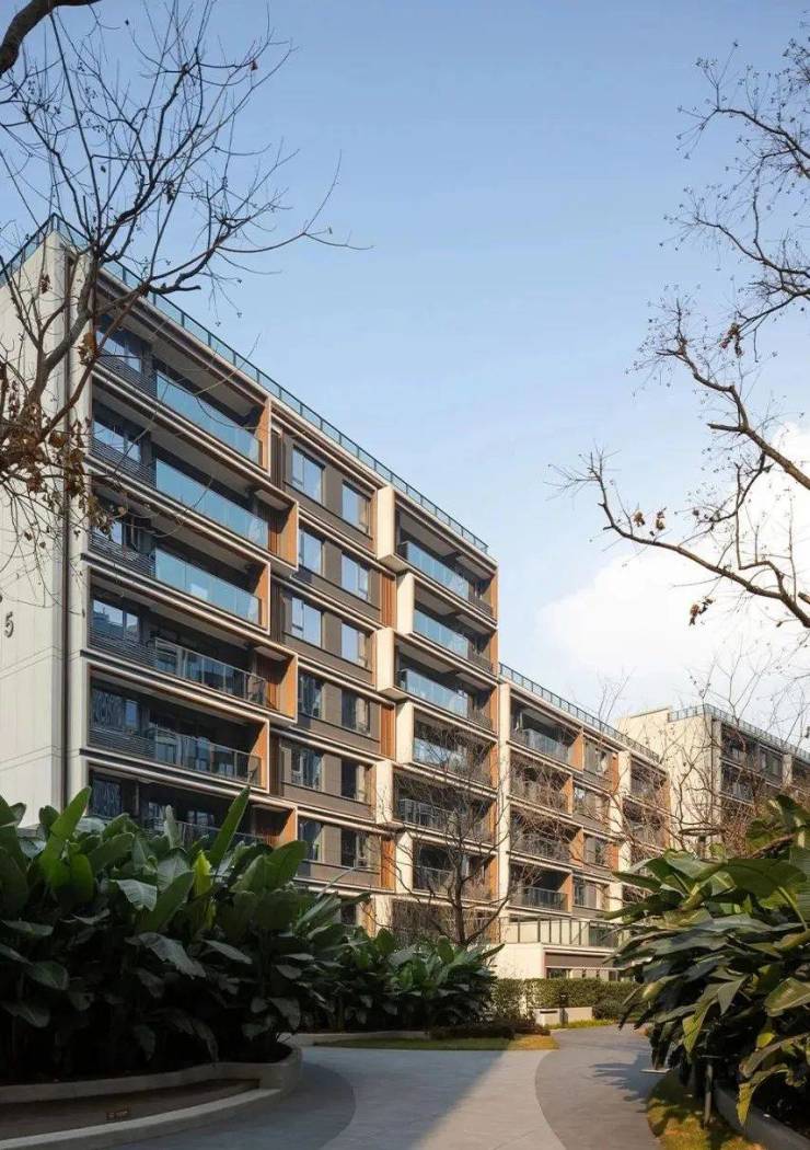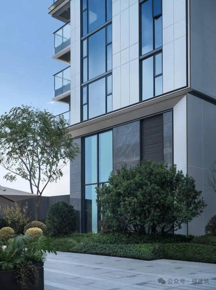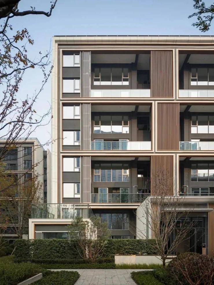 比如,由GAD设计的杭州仁恒滨江园,相较于当下商品住宅立面常用的单色灰白铝板,仁恒滨江园选用更通透、明亮的浅灰色玻璃幕墙和香槟色铝板,铝板内嵌入暖色木纹铝板,通过细节让建筑在色泽上更温暖近人。