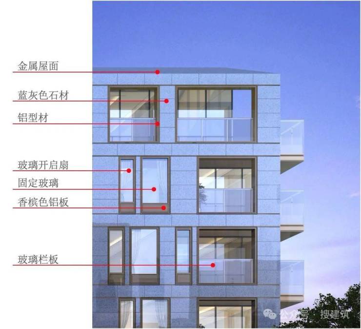 构建【五个立面层次】——雕刻石材线脚/铝板线脚/纵向金属格栅/金属窗套/巨幅玻璃