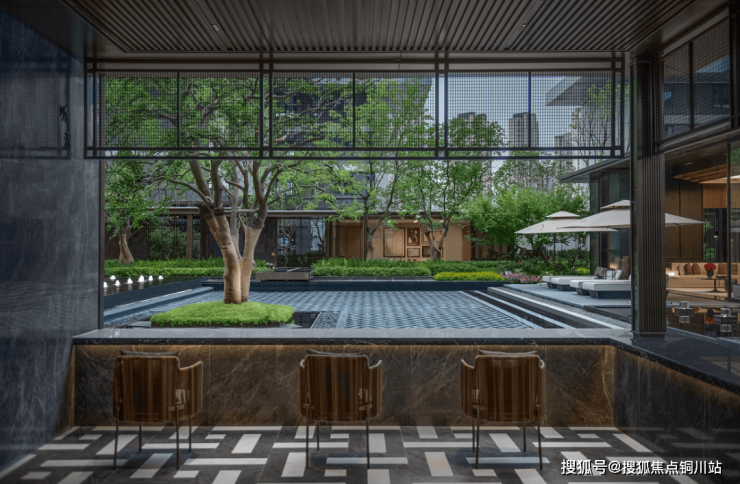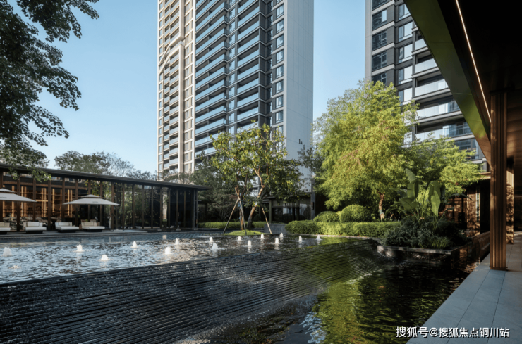 进入社区内,喷泉、绿植与连廊等交织出一幅幅都市品质生活的精致图景。