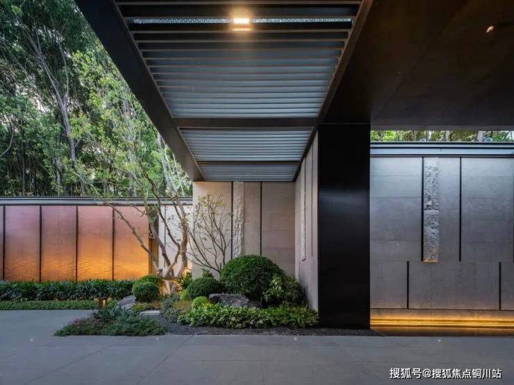 实景呈现的北府门仿佛被隐藏在城市森林中,拥有自然密林的感受,超万方香樟森林带来隐奢贵气,两侧12面奢石屏风,以及1008片水波纹铜瓦构成的艺术墙体,寓意着业主事业步步高升,将归家的体验感拉满。
