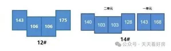 14号楼:140-103-103-128-143-168 3T4户/2T2户(两个单元,总高32层 公摊22.6%-25.4%)