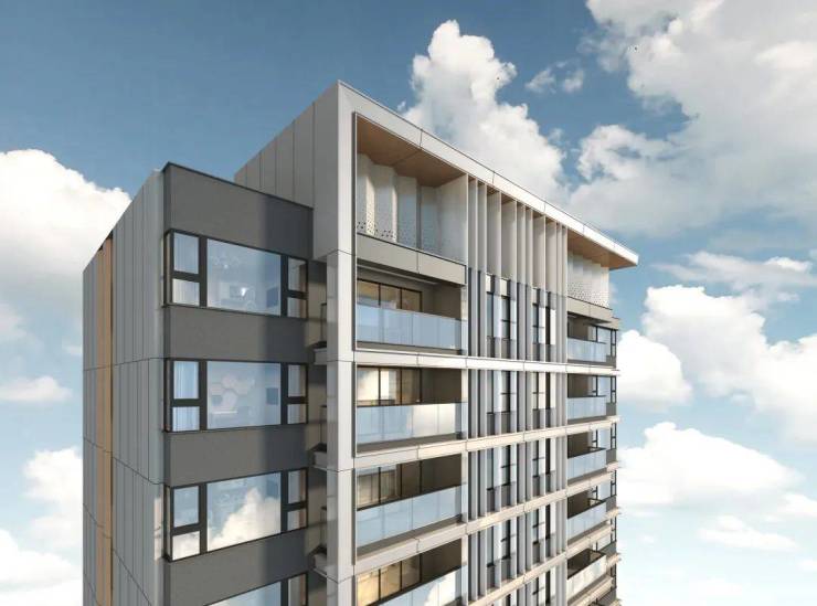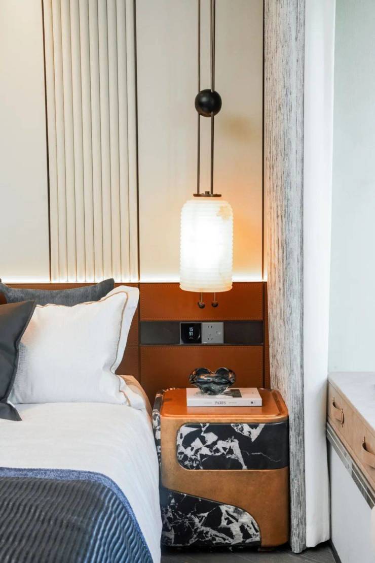 建筑西立面和阳台上方檐口用木纹铝板勾勒出古城屋檐的轻盈剪影,在复刻的「披檐」形制与花窗纹格里,触摸到传统与现代的共生密码,园林归家动线以镜面水景和几何光影演绎现代美学。正如一位业主所言:“这里不是‘占据’地段,而是让地段自然生长进生活。”