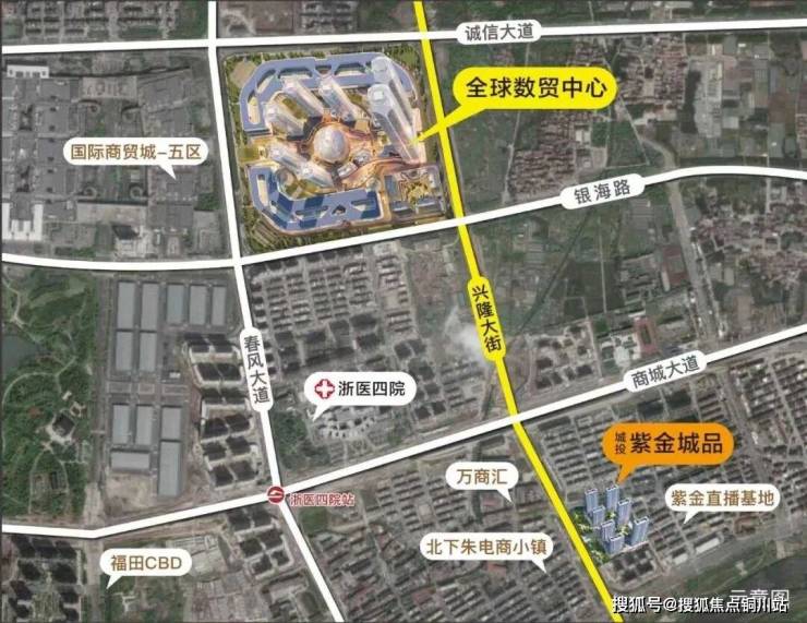 紫金城品距 125万m²全球数贸中心仅约1000米,经兴隆大街可直达,作为该 核心商圈1公里内 目前唯一在售住宅,让业主轻松享受数贸中心的复合红利。