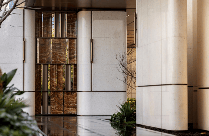 门庭延街的外立面,以精工定制弧形米色石材为主调,镶嵌典藏级老虎玉大理石,点缀古铜色现代海派艺术感灯器,整体呈现出百年海派的贵雅气质。