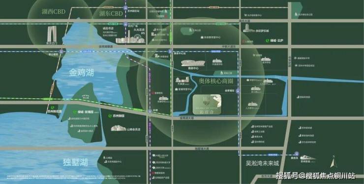 三轨穿插并行,5、6、8号线直达苏州各大核心区,金鸡湖大道、中环东线、现代大道、独墅湖大道等城市主干道汇聚在侧。