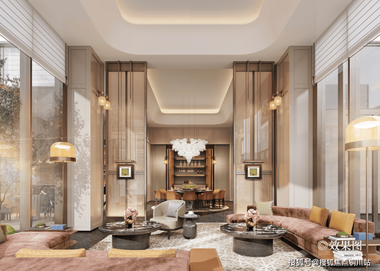 双层立体会所:约2500㎡地上地下复合空间,涵盖恒温泳池、私宴厅、SPA秘境、瑜伽健身房等多功能复合会所空间,搭配下沉庭院空间,将室外景观进一步延展,串联自然与社交。