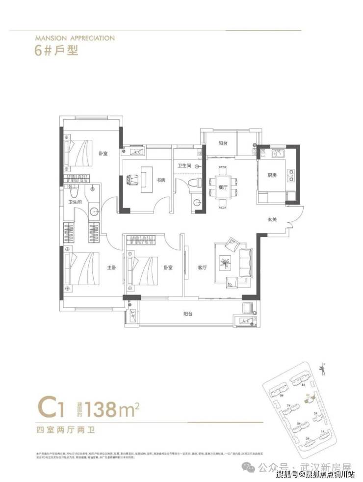 6#总高33层,一个单元,两梯四户,中间117㎡,边户138㎡,得房率87%;