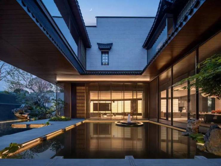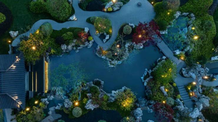 在空间布局上,项目还精心打造“两轴三进九园”的景观体系。两条归家主轴贯穿其中,一进前庭,照壁与松影相互映衬;二进中院,曲水流觞间龙光塔倒影摇曳;三进后院,红枫与叠石巧妙搭配。
