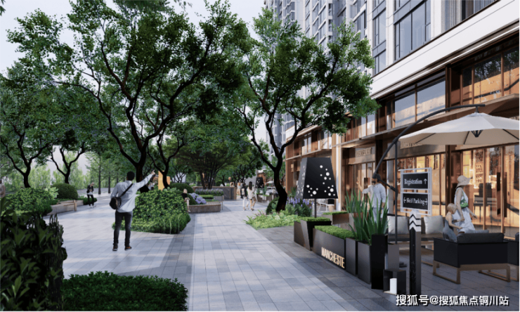 金色江岸主题的商业界面,演绎活力流淌的鎏金之境。商业廊道全长约229米,全宽超22米,以三重层次丰富空间打造全龄活动主场。外层栽种银杏、朴树等营造自然散步空间;中层打造潜水喷泉景观、约27米孩童玩乐装置供孩童玩乐;里层风情商业街满足家庭逛街购物休闲娱乐。公园型商业的自然探索,重拾都市生活松弛感。