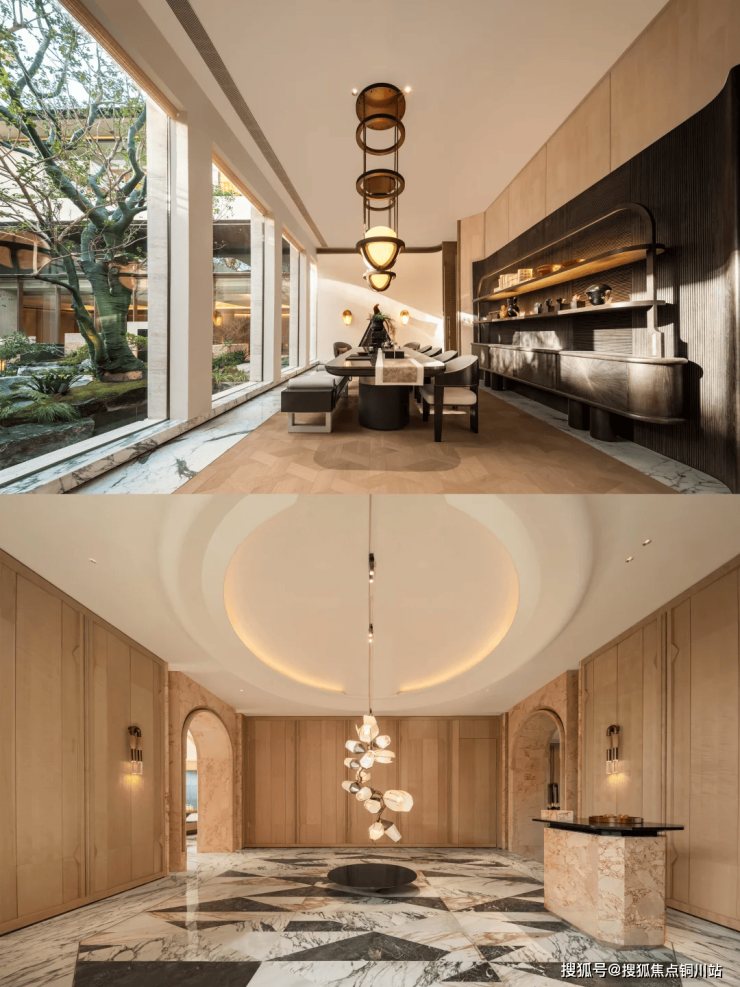 瀑布般的水幕如丝般细腻,将下沉庭院与上层空间巧妙地交织相连,水珠轻舞,幻化成朦胧之洲,营造出一种若有似无的默契。借助顶部镜面材质与四周的全景落地窗,这片角落的空间得以从多个角度融入同一幅画面,打造出既充满趣味又饱含意境的视觉盛宴。