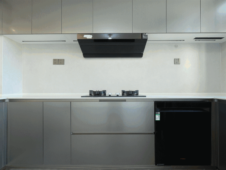 值得单独拎出来讲的还有一些生活细节的进阶,比如电梯前室预留了充足的收纳空间,采用了钢木复合子母门,预留了电动窗帘安装位,卫生间配了电热毛巾架,玄关柜和厨房吊柜下方的灯带,厨房配了凉霸等等。