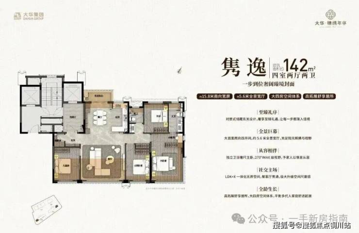 142㎡四房户型更惊艳,南向面宽约15.8米,四房格局下仍能拥有5.6米阔绰客厅开间,综合得房率最高达约106%,完美适配二胎家庭或三代同堂。