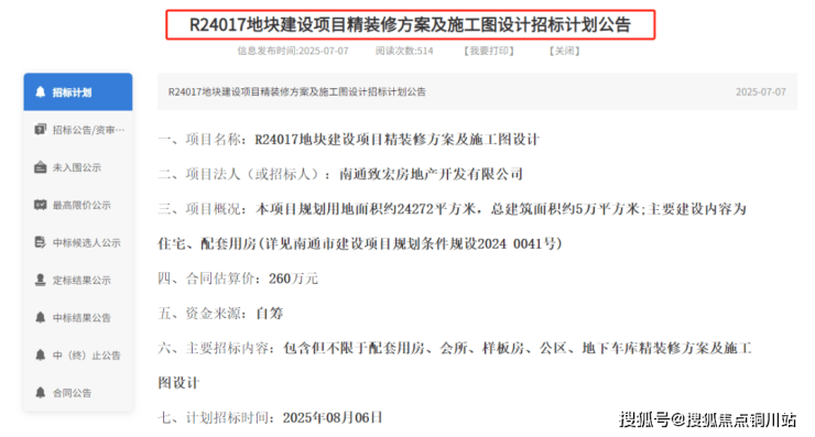 前段时间,南通市自然资源和规划局发布了《R24017地块建设项目精装修方案及施工图设计招标计划公告》,披露了项目更多的产品亮点。