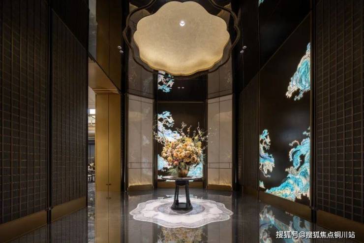 室内设计同样很美,别人只是挂副临摹画,建发更以国家级非遗技艺——掐丝珐琅的宫廷工艺,手工精心复现了《千里江山图》这幅艺术珍品,彰显了对细节的极致追求。不仅大门采用这一尊贵材质,售楼处内部及单元入户大堂亦精心布置了同款掐丝珐琅背景墙,将传统艺术与现代设计完美融合。