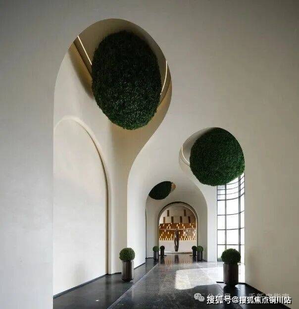 穿过人行入口,便是艺术感十足的穹顶连廊,走在这里如同进入了度假酒店,极其惬意。