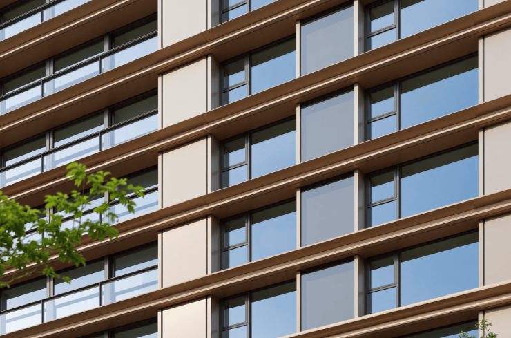 从实景呈现来看,大面积玻璃幕墙、银灰色铝板和古铜金色线条锻造的建筑立面,色感、光感恰到好处。