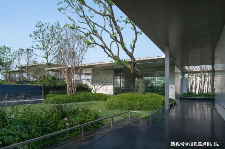 对景墙上水幕跌落,几何宽幕配以高大的丛生乌桕来界定视觉至高点。轻薄的飘板悬于片墙之上,树影斑驳,婆婆娑娑映照于墙面,使时间与光影重叠。