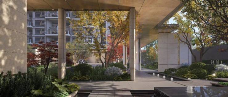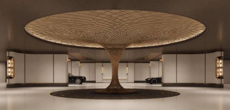 首先看52米宽的社区大门。最亮眼最中心的,是以“嵩山云雾”为主题的雕塑。独创的港湾落客区和双车道进出大门,也充满仪式感。地下中央车站,这可以理解为地下停车场的落客区,不管是业主归家还是访客,既方便又尊贵。以上是第一进,前院区。