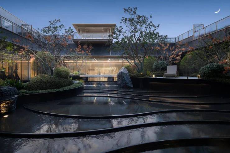 往里走,穿过约200㎡的漂浮感水院,还有以宋式园林为蓝本的下沉式庭院景观,名贵树种、叠石和造型小品,被设计“漂浮”于水景之上,站在一旁的连廊下,一抬头、一转身,都能有不一样的景致。