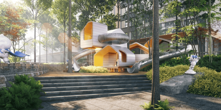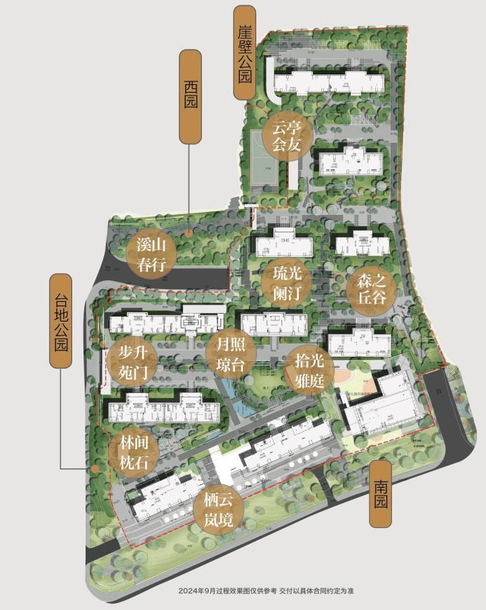 项目园林采用“一轴三区九景”的设计理念,以中心景观区为中轴线,规划三大景观组团、九大特色节点,三大院落分别将三个出入口环抱其中。三大景观组团分为南北双中心以及中央大花园三大景观组团,园区内设计有九大特色景观(栖云岚境、林间枕石、拾光雅汀、月照琼台、步升苑门、森之丘谷、琉光阑汀、溪山春行、云亭会友),根据场地高差打造全龄活动场地,在不同的平台演绎不同的生活场景。