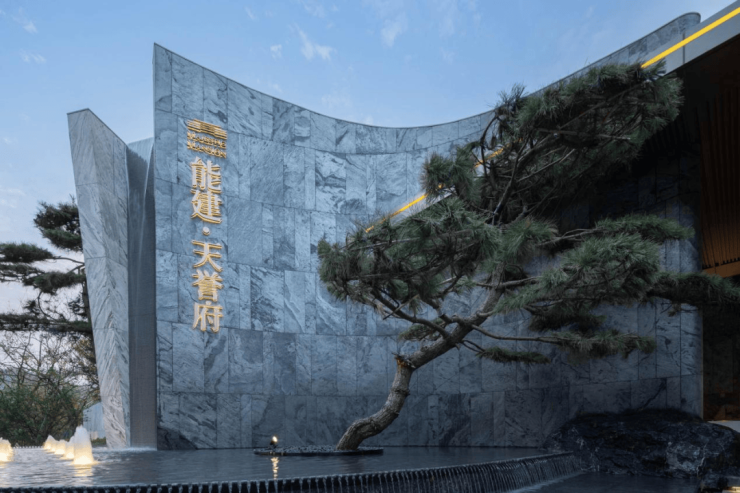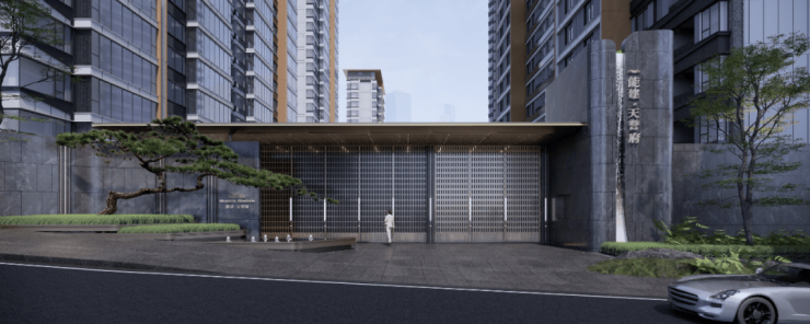隐奢典藏大门,奢石景墙,造型有“开卷望府”寓意。入门处的水景及造型叠水,寓意聚水引财。