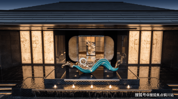 30米阔尺门头以范思哲黑石材为底,龙形曲线雕塑与叠级水景构成“迎龙观月”的归家仪式,寓意“石中藏玉,礼跃龙门”。