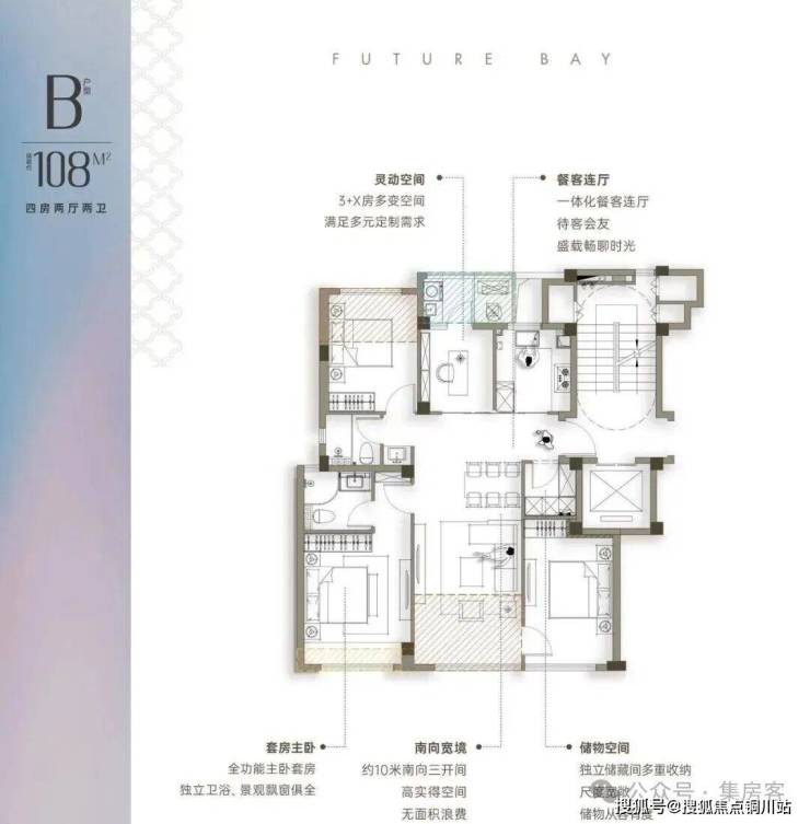 全能收纳王入户标配储藏间,同时三个卧室均预留了衣柜区。108方户型布局差不多,但北面多一个房间。
