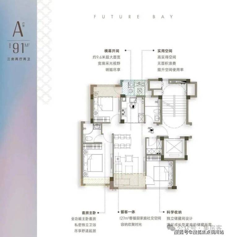 建面约91方真三房户型,真南北通透洋房产品北侧无消防连廊设计,小面积也是真南北通透,区别市面2+ 1户型,最小的卧室也有将近9个平方,每个卧室面宽均达到3米及以上