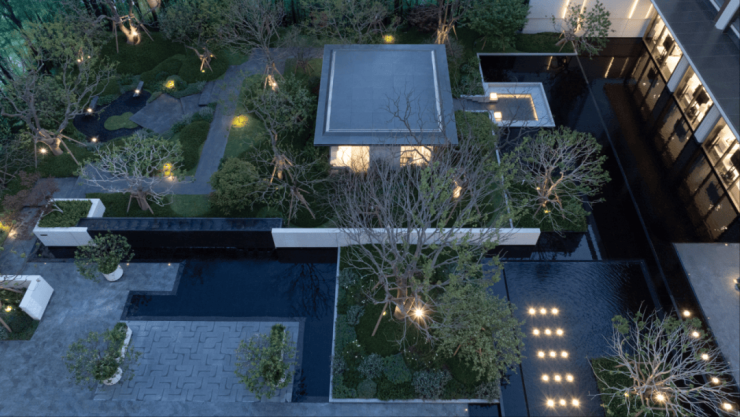 项目园林景观以“引水琢玉 引江入园”为核心理念,以长江为脉,将长江的灵动气韵与壮阔意境融入园林细节,让水景、绿植与光影交织成趣,让居住者感受长江的脉动与自然的馈赠。